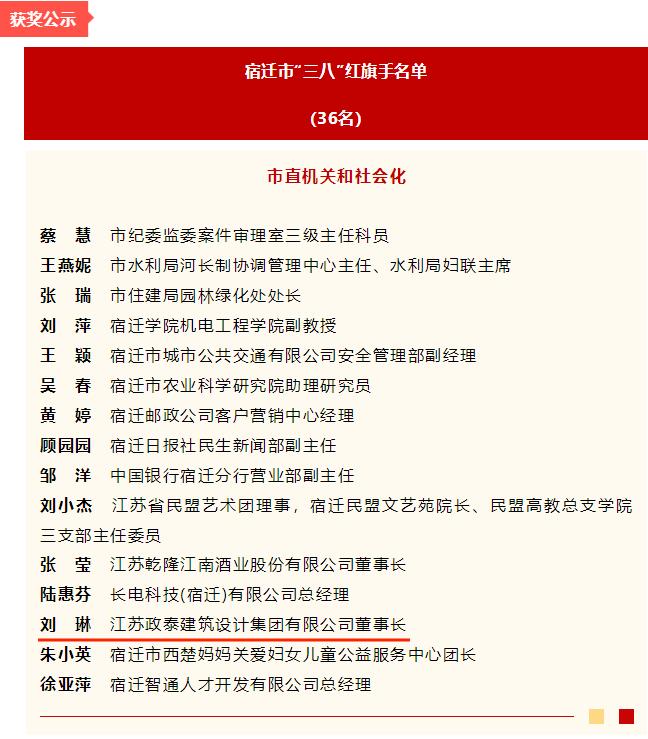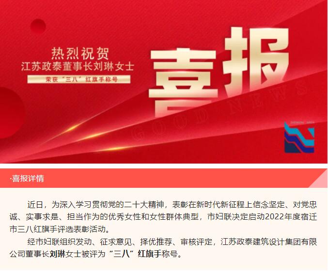 喜报丨江苏政泰董事长刘琳女士荣获“三八”红旗手称号